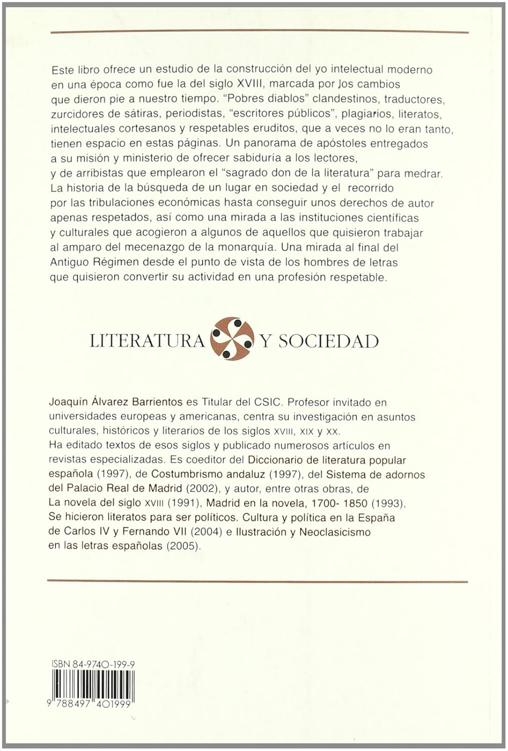 Este libro ofrece un estudio de la construcción del yo intelectual moderno en una época como fue la del siglo XVIII, marcada por los cambios que dieron pie a nuestro tiempo. Pobres diablos clandestinos, traductores, zurcidores de sátiras, periodistas, escritores públicos, plagiarios, literatas, intelectuales cortesanos y respetables eruditos, que a veces no lo eran tanto, tienen espacio en estas páginas. Un panorama de apóstoles entregados a su misión y ministerio de ofrecer sabiduría a los lectores, y de arribistas que emplearon el sagrado don de la literatura para medrar.La historia de la búsqueda de un lugar en sociedad y el recorrido por las tribulaciones económicas hasta conseguir unos derechos de autor apenas respetados, así como una mirada a las instituciones científicas y culturales que acogieron a algunos de aquellos que quisieron trabajar al amparo del mecenazgo de la monarquía. Una mirada al final del Antiguo Régimen desde el punto de vista de los hombres de letras que quisieron convertir su actividad en una profesión respetable.