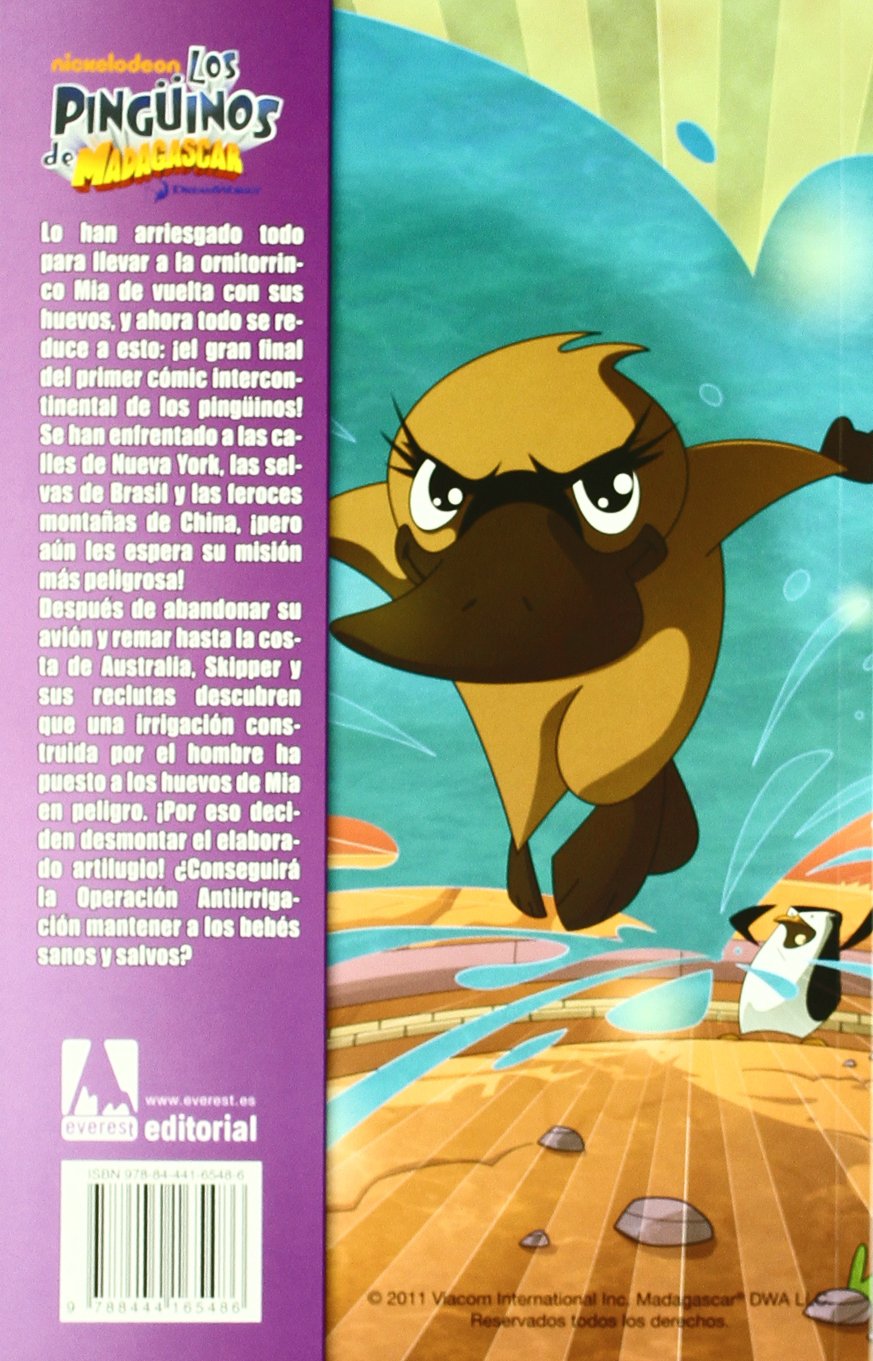 Lo han arriesgado todo para llevar a la ornitorrinco Mia de vuelta con sus huevos, y ahora todo se reduce a esto: ¡el gran final del primer cómic intercontinental de los pingüinos! Se han enfrentado a las calles de Nueva York, las selvas de Brasil y las feroces montañas de China, ¡pero aún les espera su misión más peligrosa! Después de abandonar su avión y remar hasta la costa de Australia, Skipper y sus reclutas descubren que una irrigación construida por el hombre ha puesto a los huevos de Mia en peligro. ¡Por eso deciden desmontar el elaborado artilugio! ¿Conseguirá la Operación Antiirrigación mantener a los bebés sanos y salvos?