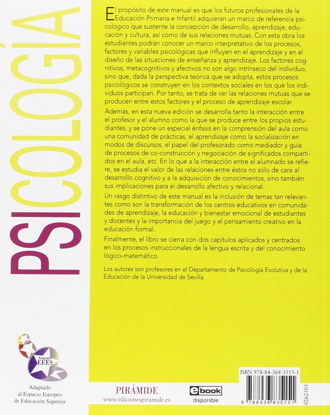 El propósito de este manual es que los futuros profesionales de la Educación Primaria e Infantil adquieran un marco de referencia psicológico que sustente la concepción de desarrollo, aprendizaje, educación y cultura, así como de sus relaciones mutuas. Con esta obra los estudiantes podrán conocer un marco interpretativo de los procesos, factores y variables psicológicas que influyen en el aprendizaje y en el diseño de las situaciones de enseñanza y aprendizaje. Los factores cognitivos, metacognitivos y afectivos no son algo intrínseco del individuo, sino que, dada la perspectiva teórica que se adopta, estos procesos psicológicos se construyen en los contextos sociales en los que los individuos participan. Por tanto, se trata de ver las relaciones mutuas que se producen entre estos factores y el proceso de aprendizaje escolar. Además, en esta nueva edición se desarrolla tanto la interacción entre el profesor y el alumno como la que se produce entre los propios estudiantes, y se pone un especial énfasis en la comprensión del aula como una comunidad de prácticas, el aprendizaje como la socialización en modos de discursos, el papel del profesorado como mediador y guía de procesos de co-construcción y negociación de significados compartidos en el aula, etc. En lo que a la interacción entre el alumnado se refiere, se estudia el valor de las relaciones entre éstos no sólo de cara al desarrollo cognitivo y a la adquisición de conocimientos, sino también sus implicaciones para el desarrollo afectivo y relacional. Un rasgo distintivo de este manual es la inclusión de temas tan relevantes como son la transformación de los centros educativos en comunidades de aprendizaje, la educación y bienestar emocional de estudiantes y docentes y la importancia del juego y el pensamiento creativo en la educación formal. Finalmente, el libro se cierra con dos capítulos aplicados y centrados en los procesos instruccionales de la lengua escrita y del conocimiento lógico-matemático.