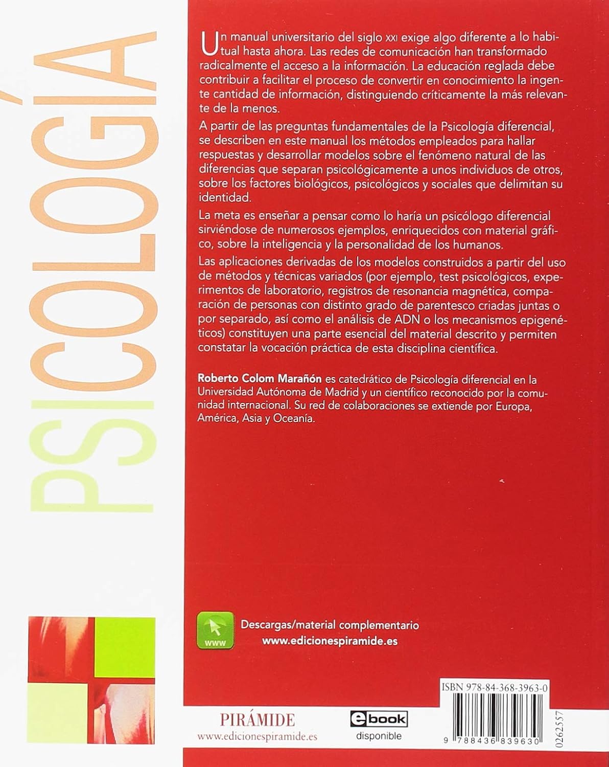 Un manual universitario del siglo xxi exige algo diferente a lo habitual hasta ahora. Las redes de comunicación han transformado radicalmente el acceso a la información. La educación reglada debe contribuir a facilitar el proceso de convertir en conocimiento la ingente cantidad de información, distinguiendo críticamente la más relevante de la menos. A partir de las preguntas fundamentales de la Psicología diferencial, se describen en este manual los métodos empleados para hallar respuestas y desarrollar modelos sobre el fenómeno natural de las diferencias que separan psicológicamente a unos individuos de otros, sobre los factores biológicos, psicológicos y sociales que delimitan su identidad. La meta es enseñar a pensar como lo haría un psicólogo diferencial sirviéndose de numerosos ejemplos, enriquecidos con material gráfico, sobre la inteligencia y la personalidad de los humanos. Las aplicaciones derivadas de los modelos construidos a partir del uso de métodos y técnicas variados (por ejemplo, test psicológicos, experimentos de laboratorio, registros de resonancia magnética, comparación de personas con distinto grado de parentesco criadas juntas o por separado, así como el análisis de ADN o los mecanismos epigenéticos) constituyen una parte esencial del material descrito y permiten constatar la vocación práctica de esta disciplina científica.