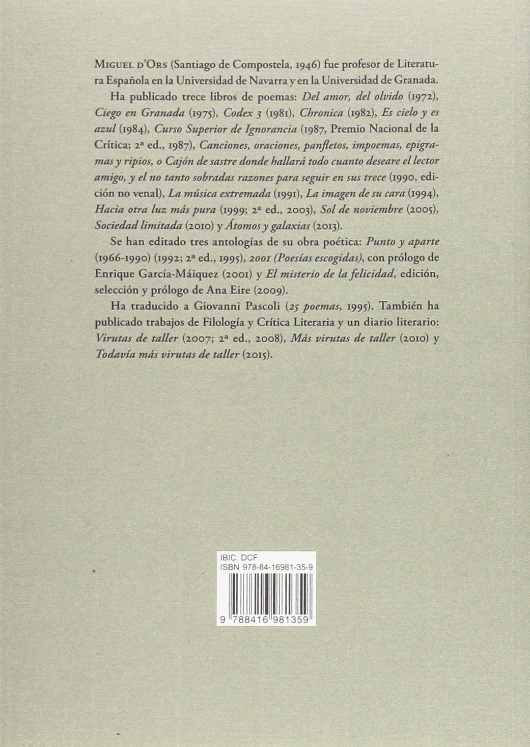 Miguel dOrs (Santiago de Compostela, 1946) fue profesor de Literatura Española en la Universidad de Navarra y en la Universidad de Granada. Ha publicado trece libros de poemas: Del amor, del olvido (1972), Ciego en Granada (1975), Codex 3 (1981), Chronica (1982), Es cielo y es azul (1984), Curso Superior de Ignorancia (1987, Premio Nacional de la Crítica; 2ª ed., 1987), Canciones, oraciones, panfletos, impoemas, epigramas y ripios, o Cajón de sastre donde hallará todo cuanto deseare el lector amigo, y el no tanto sobradas razones para seguir en sus trece (1990, edición no venal), La música extremada (1991), La imagen de su cara (1994), Hacia otra luz más pura (1999; 2ª ed., 2003), Sol de noviembre (2005), Sociedad limitada (2010) y Átomos y galaxias (2013). Se han editado tres antologías de su obra poética: Punto y aparte (1966-1990) (1992; 2ª ed., 1995), 2001 (Poesías escogidas), con prólogo de Enrique García-Máiquez (2001) y El misterio de la felicidad, edición, selección y prólogo de Ana Eire (2009). Ha traducido a Giovanni Pascoli (25 poemas, 1995). También ha publicado trabajos de Filología y Crítica Literaria y un diario literario: Virutas de taller (2007; 2ª ed., 2008), Más virutas de taller (2010) y Todavía más virutas de taller (2015).