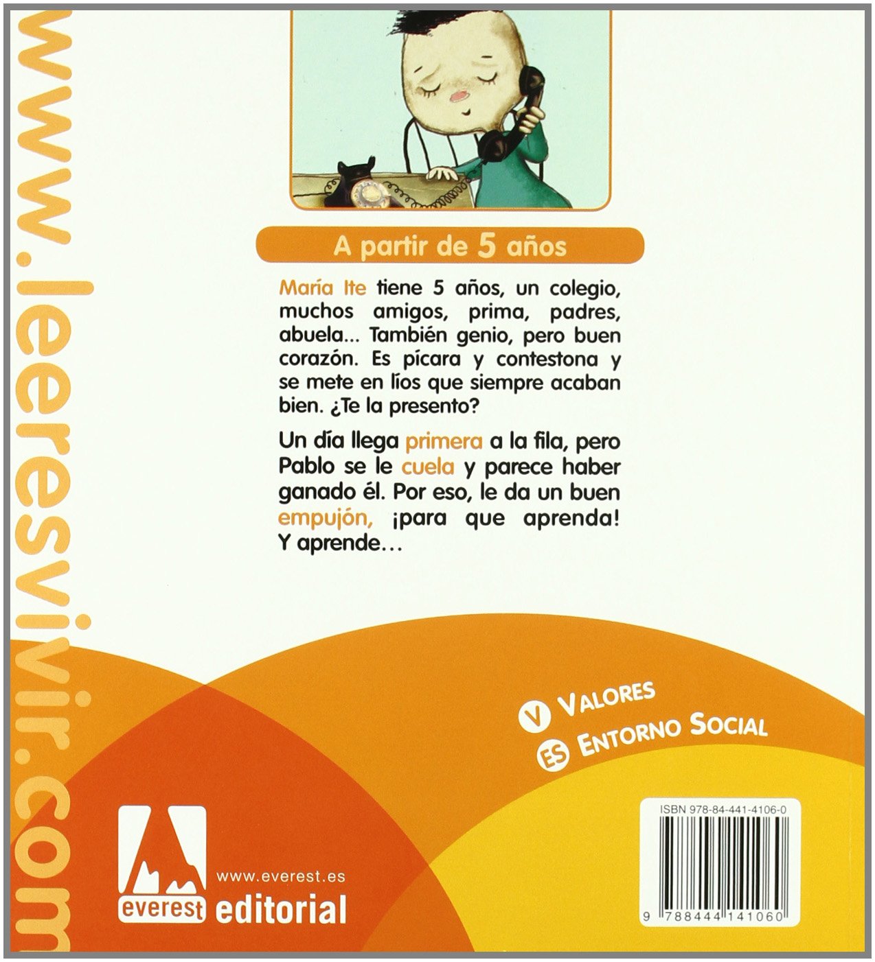 María Ite tiene 5 años, un colegio, muchos amigos, prima, padres, abuelos… También genio, malhumor y buen corazón. Es pícara y contestona y se mete en líos que siempre acaban bien. ¿Te la presento? Un día llega primera a la fila, pero Pablo se le cuela y parece haber ganado él. Por eso, le da un buen empujón, ¡para que aprenda! Y aprende…
