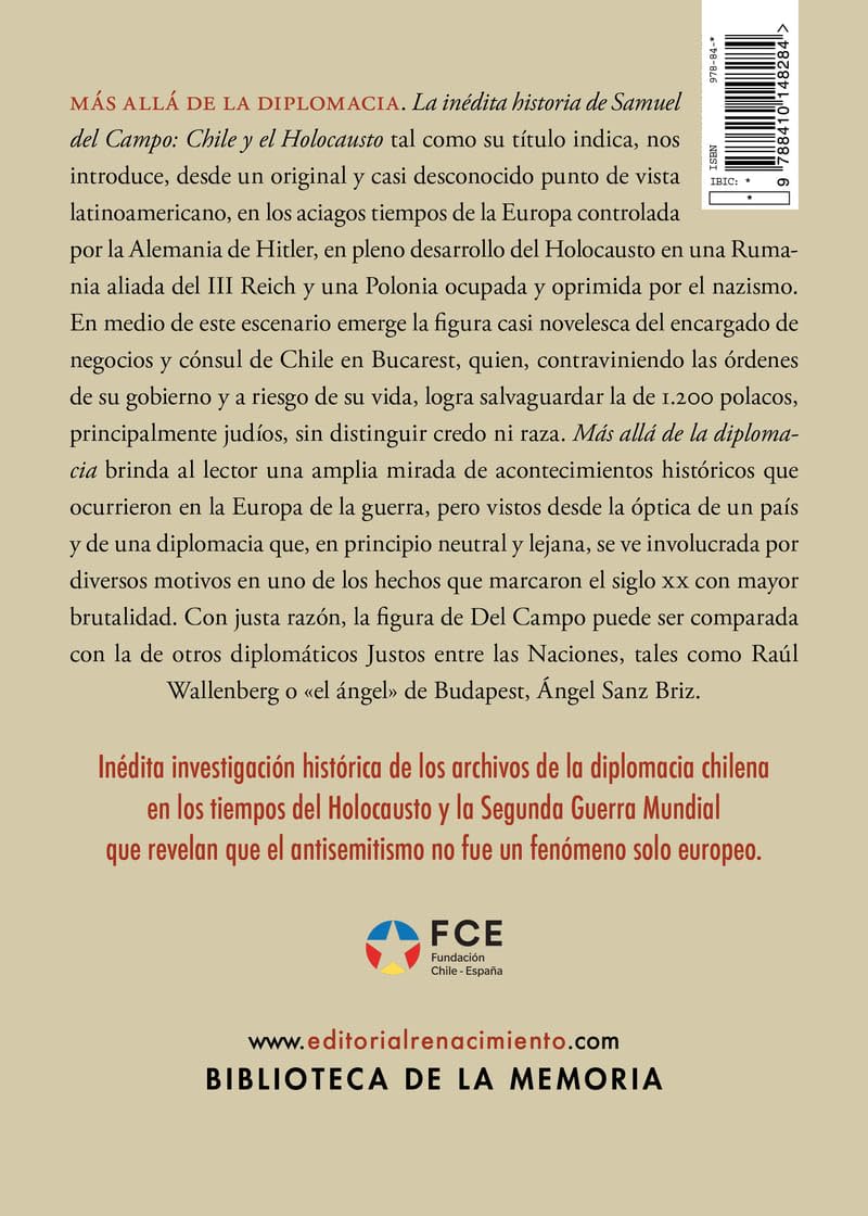 Más allá de la diplomacia. La inédita historia de Samuel del Campo: Chile y el Holocausto tal como su título indica, nos introduce, desde un original y casi desconocido punto de vista latinoamericano, en los aciagos tiempos de la Europa controlada por la Alemania de Hitler, en pleno desarrollo del Holocausto en una Rumania aliada del III Reich y una Polonia ocupada y oprimida por el nazismo. En medio de este escenario emerge la figura casi novelesca del encargado de negocios y cónsul de Chile en Bucarest, quien, contraviniendo las órdenes de su gobierno y a riesgo de su vida, logra salvaguardar la de 1.200 polacos, principalmente judíos, sin distinguir credo ni raza. Más allá de la diplomacia brinda al lector una amplia mirada de acontecimientos históricos que ocurrieron en la Europa de la guerra, pero vistos desde la óptica de un país y de una diplomacia que, en principio neutral y lejana, se ve involucrada por diversos motivos en uno de los hechos que marcaron el siglo XX con mayor brutalidad. Con justa razón, la figura de Del Campo puede ser comparada con la de otros diplomáticos Justos entre las Naciones, tales como Raúl Wallenberg o «el ángel» de Budapest, Ángel Sanz Briz. Inédita investigación histórica de los archivos de la diplomacia chilena en los tiempos del Holocausto y la Segunda Guerra Mundial que revelan que el antisemitismo no fue un fenómeno solo europeo. Jorge E. Schindler (Viña del Mar, Chile, 1968). Historiador y diplomático. Tras graduarse en la Pontificia Universidad Católica de Valparaíso, residió algunos años en Suiza, país de origen de parte de su familia. Durante este periodo trabajó y realizó estudios de lengua alemana y francesa en la Universidad de Friburgo. En 1997 ingresó a la Academia Diplomática de Chile Andrés Bello. Durante su carrera ha desempeñado cargos en las embajadas en la Federación de Rusia, Colombia, Alemania, España y Portugal. Entre 2012 y 2014 investigó en los archivos históricos del Ministerio de Relaciones Exteriores de Chile, descubriendo la, hasta entonces, inédita trayectoria y obra humanitaria del diplomático Samuel del Campo en Rumania durante la Segunda Guerra Mundial. Dicha investigación dio origen al libro Más allá de la diplomacia. La inédita historia de Samuel del Campo: Chile y el Holocausto, obra que ha sido traducida a la lengua polaca y al rumano. Asimismo, las principales conclusiones de su trabajo fueron publicadas por la revista británica The Galitzianer. Ha sido distinguido con el Premio «Luz y Memoria 2014» por la Comunidad Judía de Chile.
