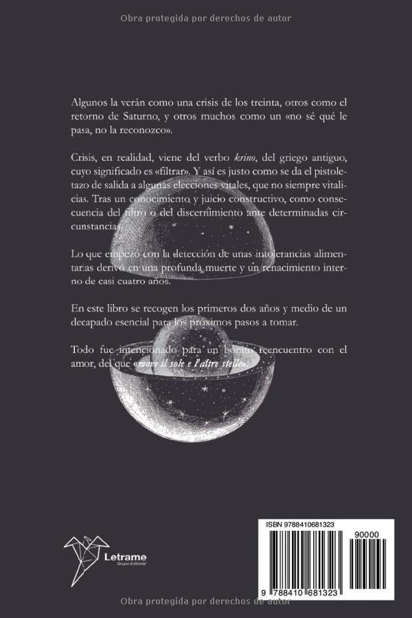 Algunos la verán como una crisis de los treinta, otros como el retorno de Saturno, y otros muchos como un ¨no sé qué le pasa, no la reconozco¨.Crisis, en realidad, viene del verbo krino, del griego antiguo, cuyo significado es ¨filtrar¨. Y así es justo como se da el pistoletazo de salida a algunas elecciones vitales, que no siempre vitalicias. Tras un conocimiento y juicio constructivo, como consecuencia del filtro o del discernimiento ante determinadas circunstancias.Lo que empezó con la detección de unas intolerancias alimentarias derivó en una profunda muerte y un renacimiento interno de casi cuatro años.En este libro se recogen los primeros dos años y medio de un decapado esencial para los próximos pasos a tomar.Todo fue intencionado para un bonito reencuentro con el amor, del que ¨move il sole e l’altre stelle¨.