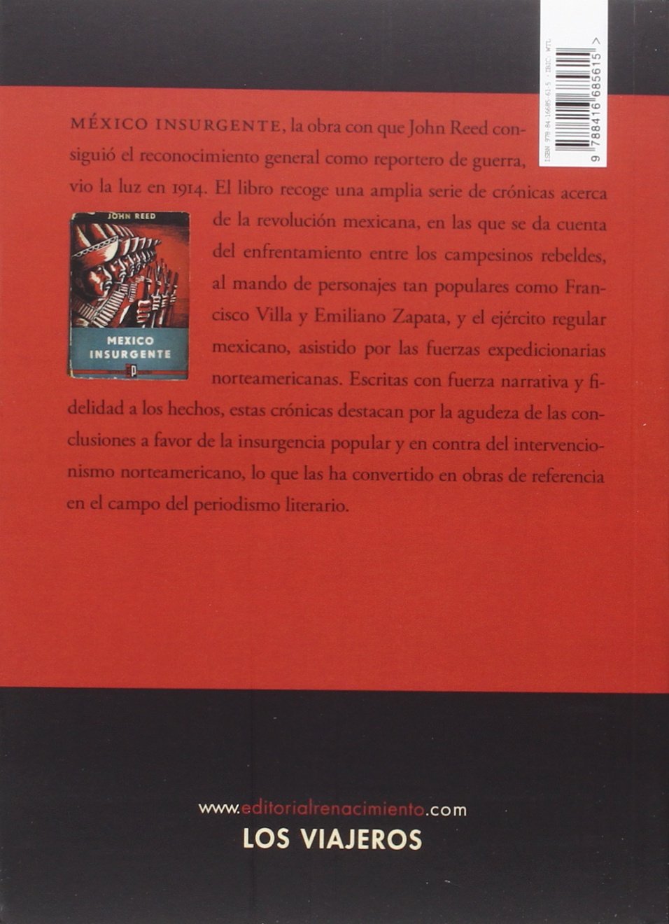 México insurgente, la obra con que John Reed consiguió el reconocimiento general como reportero de guerra, vio la luz en 1914. El libro recoge una amplia serie de crónicas acerca de la revolución mexicana, en las que se da cuenta del enfrentamiento entre los campesinos rebeldes, al mando de personajes tan populares como Francisco Villa y Emiliano Zapata, y el ejército regular mexicano, asistido por las fuerzas expedicionarias norteamericanas. Escritas con fuerza narrativa y fidelidad a los hechos, estas crónicas destacan por la agudeza de las conclusiones a favor de la insurgencia popular y en contra del intervencionismo norteamericano, lo que las ha convertido en obras de referencia en el campo del periodismo literario. John Reed (Portland, 1887-Moscú, 1920) fue un destacado periodista y dirigente obrero estadounidense. Se graduó de la Universidad de Harvard en 1910, e inició su carrera de periodismo para una publicación Socialista. Célebre por sus reportajes sobre las revoluciones mexicana y rusa, participó en la fundación del Partido Comunista de los Estados Unidos de América. Es autor de México insurgente (1914) y Diez días que estremecieron al mundo (1918). Acusado de espionaje, tuvo que huir a la URSS en 1919. Un año después falleció de tifus en Moscú y fue enterrado en la Plaza Roja, junto al Kremlin, como héroe de la Revolución. John dos Passos llegó a considerarle «el mejor escritor americano de su época».