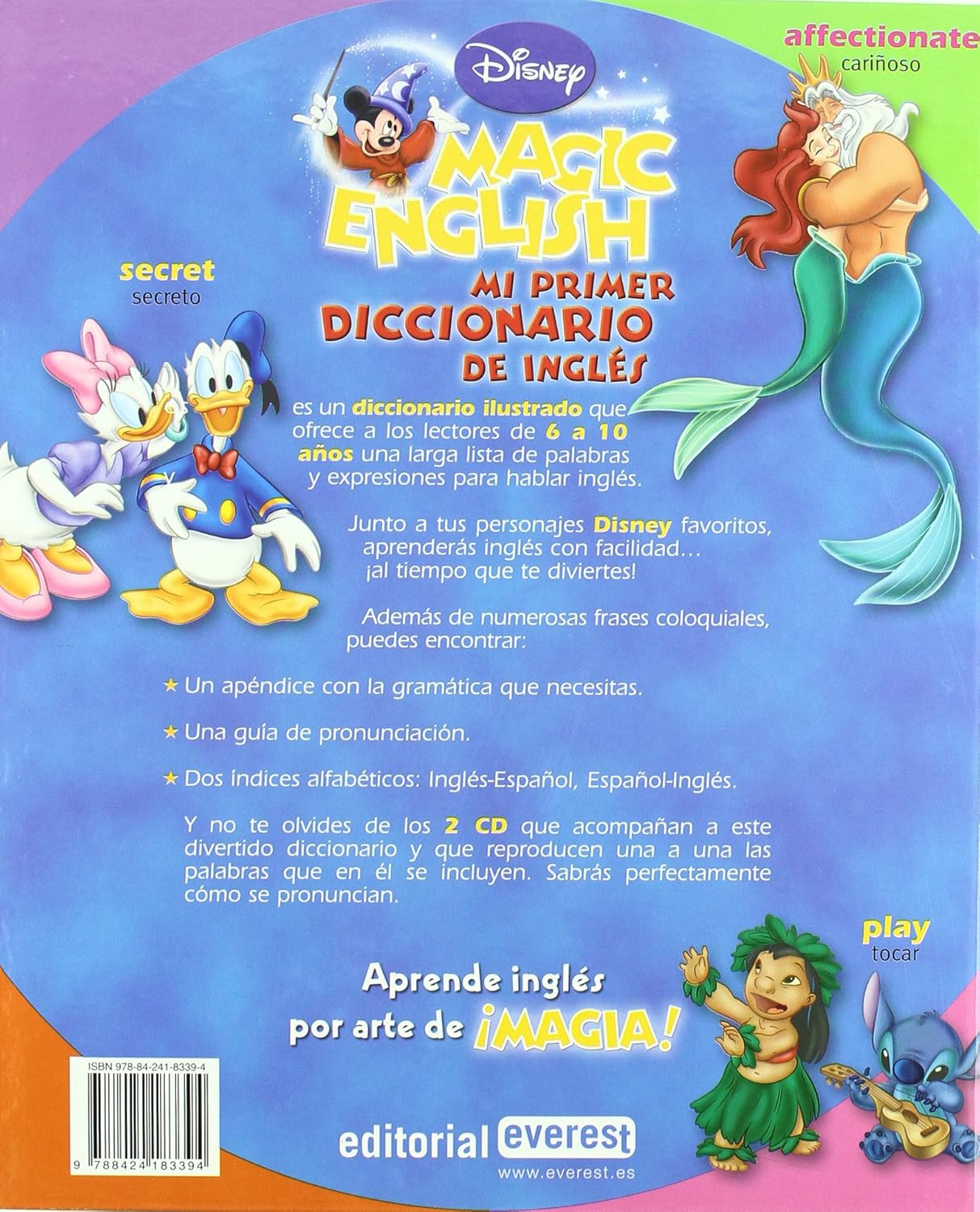 Diccionario temático bilingüe para niños que están aprendiendo inglés como segunda lengua. Compuesto por cerca de 1.000 entradas, los personajes más conocidos de Disney ilustran cada ejemplo. El contenido se divide en dobles páginas temáticas, introducidas por escenas cotidianas cercanas a los niños: cuerpo, hogar, colegio… sin dejar de lado el mundo maravillosos de la fantasía. Generalmente, en la página par se incluye una ilustración grande de la que salen flechas con vocabulario en inglés y su traducción. En la impar, se añaden más entradas relacionadas con la materia, ilustradas con imágenes más pequeñas. De cada una de ellas se da traducción, ejemplo de uso y traducción del ejemplo