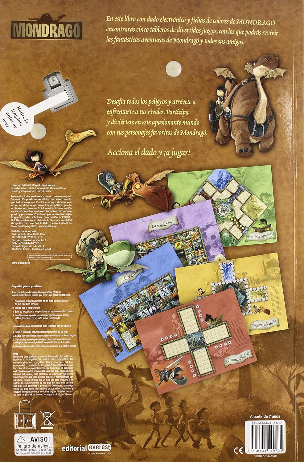 Libro de cartón con 5 juegos de mesa conocidos o inventados, adaptados al mundo de Mondragó. Llega a tu casa del parchís: al Bosque de la Niebla, la dragonería, El castillo de Wickenburg…; rescata a Mondragó, el malvado Murda le ha raptado en el juego ¡Al rescate! El formato permite que cada doble página sea un tablero de juego y el dado electrónico y las fichas de colores, la participación de 4 jugadores. ¿Te animas? ACCIONA EL DADO Y… ¡A jugar!