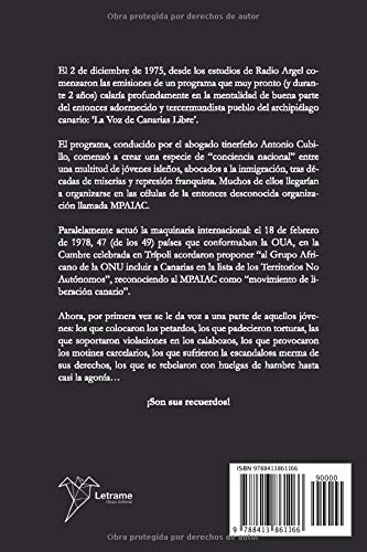 El 2 de diciembre de 1975, desde los estudios de Radio Argel comenzaron las emisiones de un programa que muy pronto (y durante 2 años) calaría profundamente en la mentalidad de buena parte del entonces adormecido y tercermundista pueblo del archipiélago canario: ‘La Voz de Canarias Libre’. El programa, conducido por el abogado tinerfeño Antonio Cubillo, comenzó a crear una especie de “conciencia nacional” entre una multitud de jóvenes isleños, abocados a la inmigración, tras décadas de miserias y represión franquista. Muchos de ellos llegarían a organizarse en las células de la entonces desconocida organización llamada MPAIAC.Paralelamente actuó la maquinaria internacional: el 18 de febrero de 1978, 47 (de los 49) países que conformaban la OUA, en la Cumbre celebrada en Trípoli acordaron proponer “al Grupo Africano de la ONU incluir a Canarias en la lista de los Territorios No Autónomos”, reconociendo al MPAIAC como “movimiento de liberación canario”.Ahora, por primera vez se le da voz a una parte de aquellos jóvenes: los que colocaron los petardos, los que padecieron torturas, las que soportaron violaciones en los calabozos, los que provocaron los motines carcelarios, los que sufrieron la escandalosa merma de sus derechos, los que se rebelaron con huelgas de hambre hasta casi la agonía…¡Son sus recuerdos!