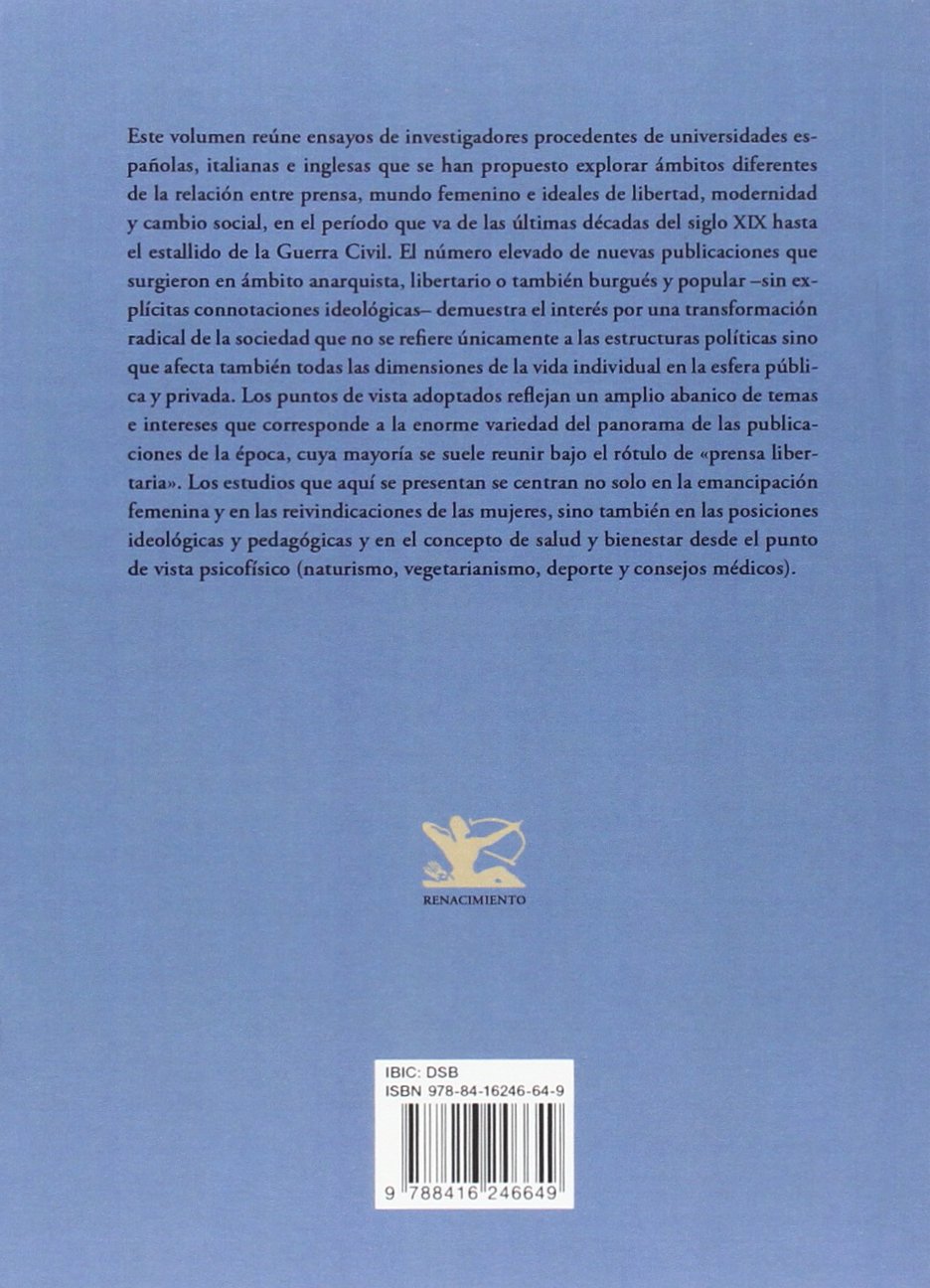 Este volumen reúne ensayos de investigadores procedentes de universidades españolas, italianas e inglesas que se han propuesto explorar ámbitos diferentes de la relación entre prensa, mundo femenino e ideales de libertad, modernidad y cambio social, en el período que va de las últimas décadas del siglo XIX hasta el estallido de la Guerra Civil. El número elevado de nuevas publicaciones que surgieron en ámbito anarquista, libertario o también burgués y popular -sin explícitas connotaciones ideológicas- demuestra el interés por una transformación radical de la sociedad que no se refiere únicamente a las estructuras políticas sino que afecta también todas las dimensiones de la vida individual en la esfera pública y privada. Los puntos de vista adoptados reflejan un amplio abanico de temas e intereses que corresponde a la enorme variedad del panorama de las publicaciones de la época, cuya mayoría se suele reunir bajo el rótulo de «prensa libertaria». Los estudios que aquí se presentan se centran no solo en la emancipación femenina y en las reivindicaciones de las mujeres, sino también en las posiciones ideológicas y pedagógicas y en el concepto de salud y bienestar desde el punto de vista psicofísico (naturismo, vegetarianismo, deporte y consejos médicos). Margherita Bernard e Ivana Rota -editoras literarias de este libro. son profesoras de Literatura Española en la Universidad de Bergamo. Entre sus áreas de investigación, centradas principalmente en el primer tercio del siglo XX, destacan la renovación de los lenguajes poéticos y teatrales, la escritura femenina, sobre todo en teatro y revistas y la obra narrativa y periodística de Magda Donato (Bernard) y de Halma Angélico (Rota). En editoriales italianas han publicado varios volúmenes colectivos dedicados a la presencia femenina en la prensa y en la cultura de las primeras décadas del Novecientos: Papel de mujeres/Mujeres de papel. Periodismo y comunicación del siglo XIX a nuestros días (2008), En prensa. Escritoras y periodistas en España (1900-1939) (2010) y Nuevos modelos. Cultura, moda y literatura (España 1900-1039) (2012).