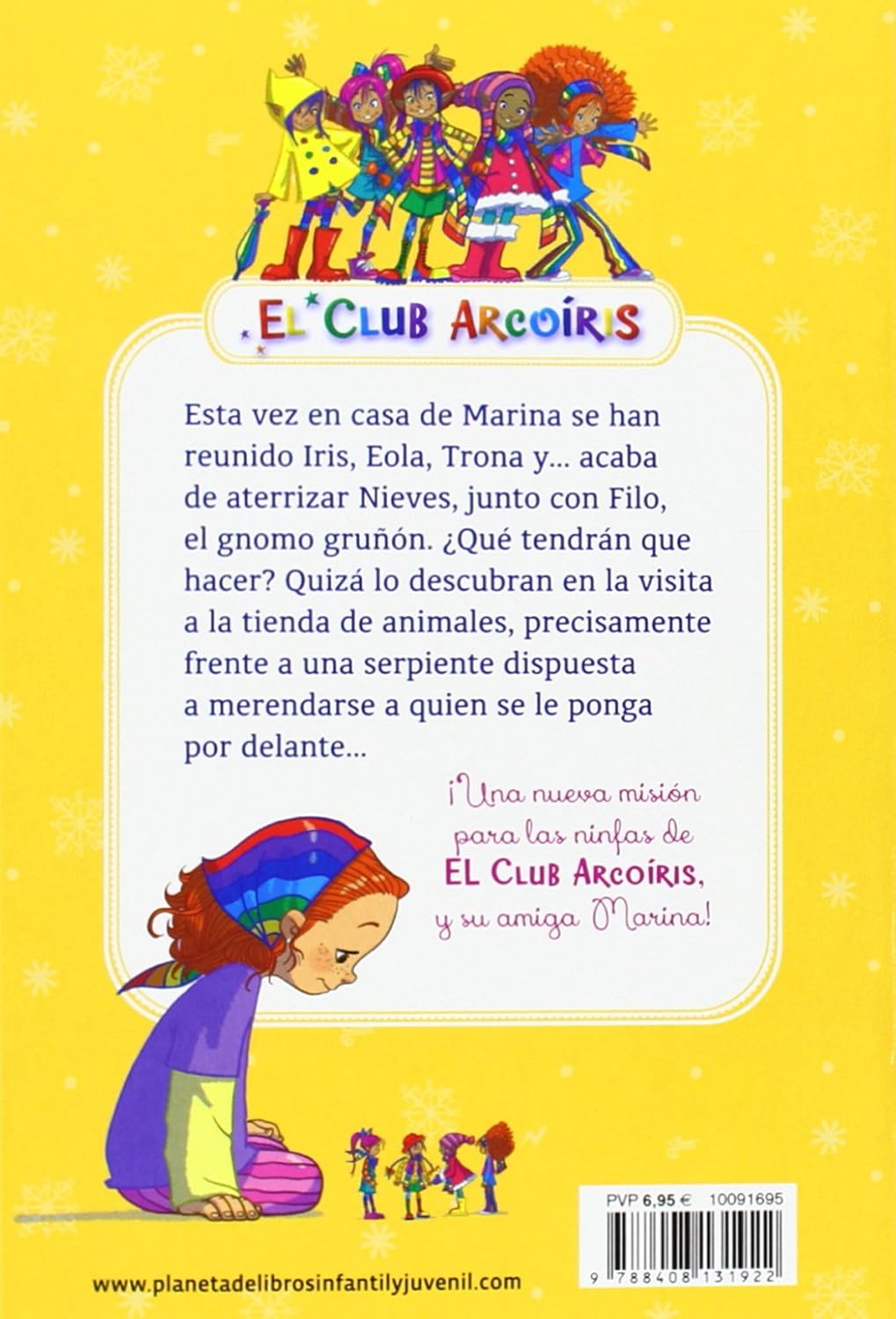 Esta vez la misión del Club Arcoíris debe ser muy complicada porque en casa de Marina se han reunido Iris, Eola, Trona y… acaba de aterrizar Nieves, junto con Filo, el gnomo gruñón ¿Qué tendrán que hacer? Quizá lo descubran en la visita a la tienda de animales, precisamente frente a una serpiente dispuesta a merendarse a quien se le ponga por delante…