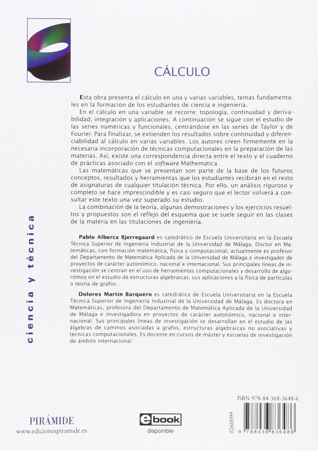Esta obra presenta el cálculo en una y varias variables, temas fundamentales en la formación de los estudiantes de ciencia e ingeniería. En el cálculo en una variable se recorre: topología, continuidad y derivabilidad, integración y aplicaciones. A continuación se sigue con el estudio de las series numéricas y funcionales, centrándose en las series de Taylor y de Fourier. Para finalizar, se extienden los resultados sobre continuidad y diferenciabilidad al cálculo en varias variables. Los autores creen firmemente en la necesaria incorporación de técnicas computacionales en la preparación de las materias. Así, existe una correspondencia directa entre el texto y el cuaderno de prácticas asociado con el software Mathematica. Las matemáticas que se presentan son parte de la base de los futuros conceptos, resultados y herramientas que los estudiantes recibirán en el resto de asignaturas de cualquier titulación técnica. Por ello, un análisis riguroso y completo se hace imprescindible y es casi seguro que el lector volverá a consultar este texto una vez superado su estudio. La combinación de la teoría, algunas demostraciones y los ejercicios resueltos y propuestos son el reflejo del esquema que se suele seguir en las clases de la materia en las titulaciones de ingeniería.