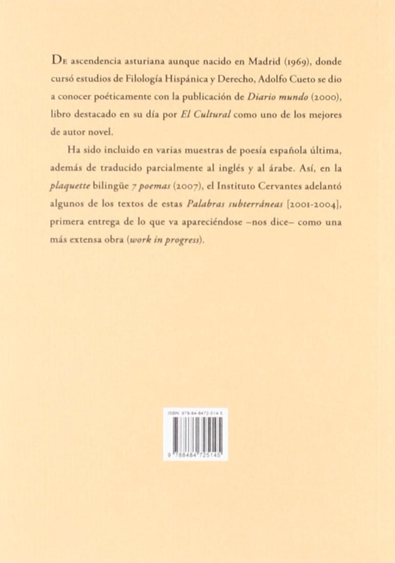 De ascendencia asturiana aunque nacido en Madrid (1969), donde cursó estudios de Filología Hispánica y Derecho, Adolfo Cueto se dio a conocer poéticamente con la publicación de Diario mundo (2000), libro destacado en su día por El Cultural como uno de los mejores de autor novel. Ha sido incluido en varias muestras de poesía española última, además de traducido parcialmente al inglés y al árabe. Así, en la plaquette bilingüe 7 poemas (2007), el Instituto Cervantes adelantó algunos de los textos de estas Palabras subterráneas [2001-2004], primera entrega de lo que va apareciéndose -nos dice- como una más extensa obra (work in progress).
