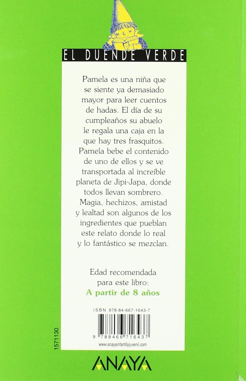 Pamela es una niña que se siente ya demasiado mayor para leer cuentos de hadas. El día de su cumpleaños recibe un regalo de su abuelo. El regalo es una caja en la que hay tres frasquitos. Pamela bebe el contenido de uno de ellos y se ve transportada al increible planeta de Jipi-Japa donde todos los seres llevan sombrero. Seres ilustres, fantásticos y humanos que todos los años celebran un concurso de sombreros para que aquel que gane cumpla alguno de sus deseos… Magia, hechizos, sentimientos de amistad y lealtad son algunos de los ingredientes que pueblan este relato donde lo real y lo fantástico se mezclan. Un relato en el que todos los personajes tienen nombre de sombrero. Al final del mismo hay un diccionario en el que, de forma sucinta y amena, se definen todos los sombreros de diferentes épocas que han aparecido.