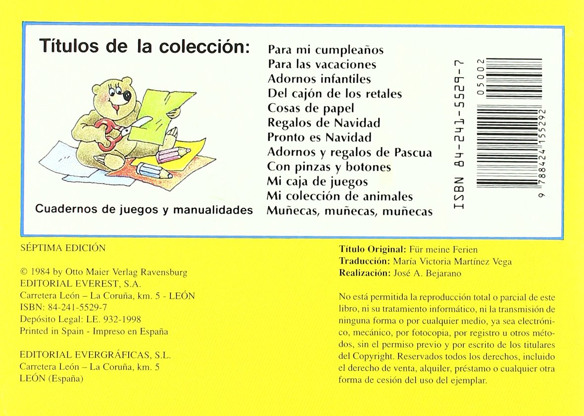 ¡Qué alegría! ¡Por fin llegaron las vacaciones! Ahora podrás quedarte más tiempo en la cama, podrás ir a bañarte, jugar, leer y divertirte. Con esa intención te he preparado en este cuaderno 12 manualidades muy especiales:Un castillo hecho de cajas, un muñeco flotador que se llama Max, un divertido juego velabolos, cajitas y estuches para tus recuerdos de vacaciones, refrescantes recetas para los días calurosos y muchas cosas más. Si preguntas a tus padres, estoy seguro que también ellos se animarán y te echarán una mano. Eso es precisamente lo más bonito, porque, ya sabes, siempre es más divertido jugar y pasar el tiempo libre formando un grupo.