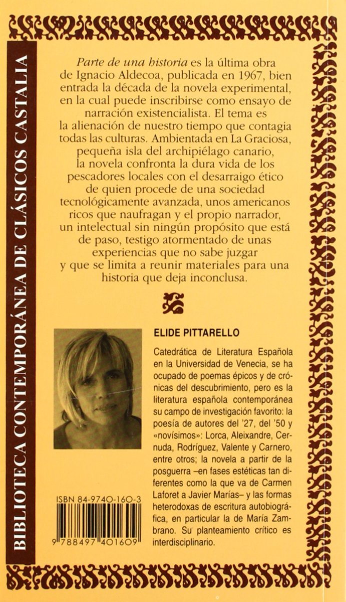PARTE DE UNA HISTORIA es la última obra de Ignacio Aldecoa, publicada en 1967, bien entrada la década de la novela experimental, en la cual puede inscribirse como ensayo de narración existencialista. El tema es la alienación de nuestro tiempo que contagia todas las culturas. Ambientada en La Graciosa, pequeña isla del archipiélago canario, la novela confronta la dura vida de los pescadores locales con el desarraigo ético de quien procede de una sociedad tecnológicamente avanzada, unos americanos ricos que naufragan y el propio narrador, un intelectual sin ningún propósito que está de paso, testigo atormentado de unas experiencias que no sabe juzgar y que se limita a reunir materiales para una historia que deja inconclusa.