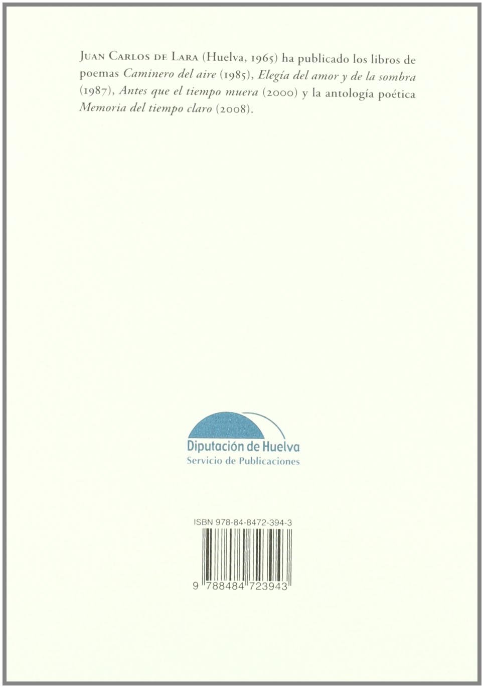 JUAN CARLOS DE LARA (Huelva, 1965) ha publicado los libros de poemas Caminero del aire (1985), Elegía del amor y de la sombra (1987), Antes que el tiempo muera (2000) y la antología poética Memoria del tiempo claro (2008).