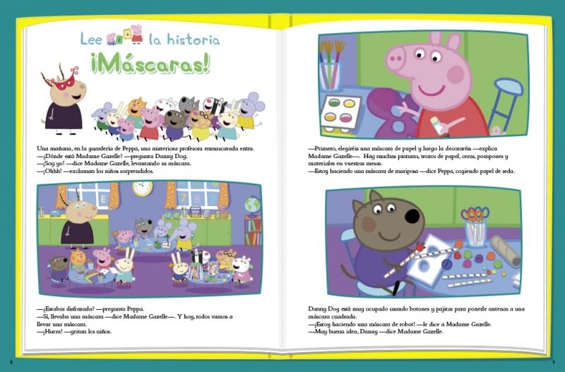 Un divertido cuaderno de actividades de Peppa Pig para que niños y niñas lo pasen en grande resolviendo pasatiempos en compañía de su personaje favorito.Y además…, ¡incluye un cuento de Peppa Pig!A Peppa le encanta descubrir cosas nuevas y vivir mil aventuras con sus amigos. ¡Acompáñala y aprende un montón de cosas con ella!En este cuaderno encontrarás:- Un montón de actividades y pasatiempos.- Instrucciones para elaborar y decorar tu propia máscara personalizada.- Una aventura inédita de Peppa Pig. ¡No te la pierdas si quieres descubrir quién se esconde detrás de la máscara!Los cuadernos de la colección «Peppa Pig. Cuaderno de actividades» de Altea, además de tener una función lúdica, constituyen una herramienta muy beneficiosa para el desarrollo cognitivo de los niños, ya que fomentan el razonamiento, la memoria, la atención y la lógica.