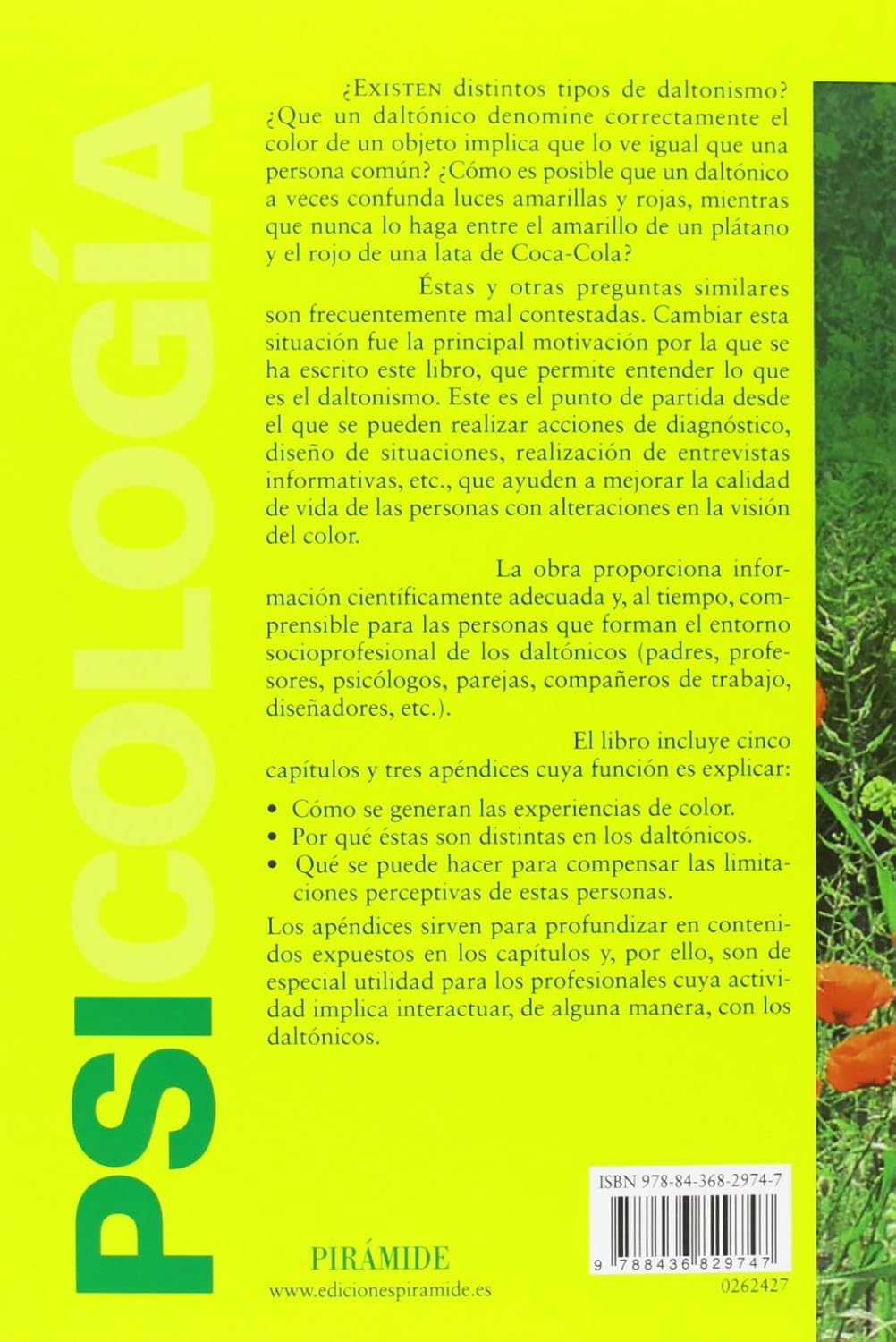 ¿Existen distintos tipos de daltonismo? ¿Que un daltónico denomine correctamente el color de un objeto implica que lo ve igual que una persona común? ¿Cómo es posible que un daltónico a veces confunda luces amarillas y rojas, mientras que nunca lo haga entre el amarillo de un plátano y el rojo de una lata de Coca-Cola? Éstas y otras preguntas similares son frecuentemente mal contestadas. Cambiar esta situación fue la principal motivación por la que se ha escrito este libro, que permite entender lo que es el daltonismo. Este es el punto de partida desde el que se pueden realizar acciones de diagnóstico, diseño de situaciones, realización de entrevistas informativas, etc., que ayuden a mejorar la calidad de vida de las personas con alteraciones en la visión del color. La obra proporciona información científicamente adecuada y, al tiempo, comprensible para las personas que forman el entorno socioprofesional de los daltónicos (padres, profesores, psicólogos, parejas, compañeros de trabajo, diseñadores, etc.). El libro incluye cinco capítulos y tres apéndices cuya función es explicar: · Cómo se generan las experiencias de color. · Por qué éstas son distintas en los daltónicos. · Qué se puede hacer para compensar las limitaciones perceptivas de estas personas. Los apéndices sirven para profundizar en contenidos expuestos en los capítulos y, por ello, son de especial utilidad para los profesionales cuya actividad implica interactuar, de alguna manera, con los daltónicos.
