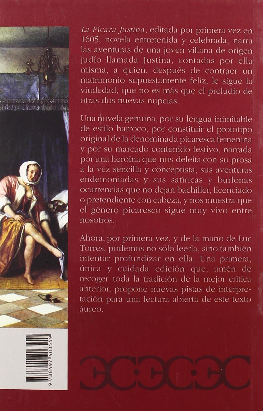 La Pícara Justina, editada por primera vez en 1605, ha estado siempre envuelta en polémicas en torno a su verdadero autor y de ella dijo el Maestro Bataillon que es uno «de los libros más difíciles del Siglo de Oro y una creación fuera de serie en el sector llamado de la novela picaresca». Entretenida y celebrada, narra las aventuras de una joven villana de origen judío llamada Justina, contadas por ella misma, a quien, después de contraer un matrimonio supuestamente feliz, le sigue la viudedad, que no es más que el preludio de otras dos nuevas nupcias cuya narración se anuncia para un segundo tomo. Una novela genuina, por su lengua inimitable de estilo barroco, por constituir el prototipo original de la denominada picaresca femenina y por su marcado contenido festivo, narrada por una heroína que nos deleita con su prosa a la vez sencilla y conceptista, sus aventuras endemoniadas y sus satíricas y burlonas ocurrencias que no dejan bachiller, licenciado o pretendiente con cabeza, y nos muestra que el género picaresco sigue muy vivo entre nosotros, pues aun hoy en cualquier esquina se esconde una Justina y, tras de cualquier libro, una novela picaresca.