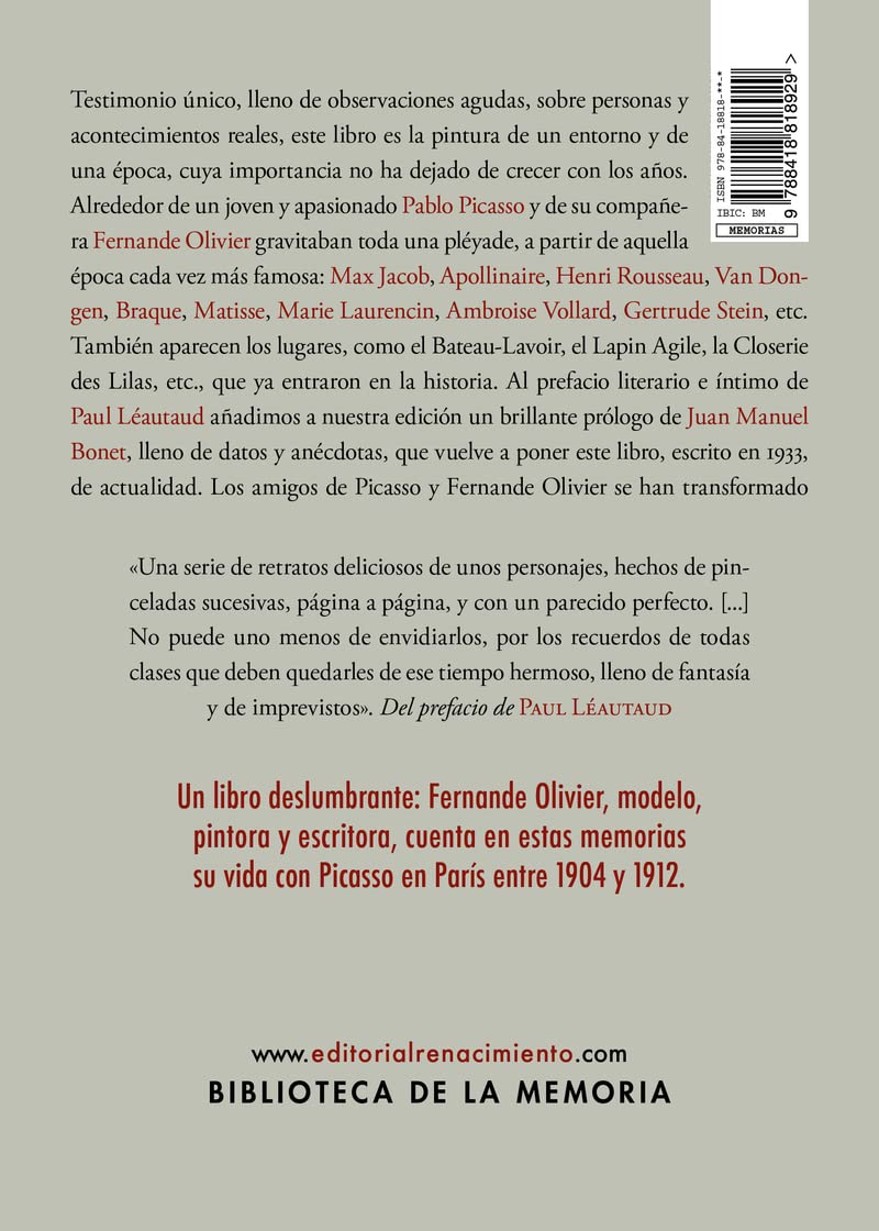 Testimonio único, lleno de observaciones agudas, sobre personas y acontecimientos reales, este libro es la pintura de un entorno y de una época, cuya importancia no ha dejado de crecer con los años. Alrededor de un joven y apasionado Pablo Picasso y de su compañera Fernande Olivier gravitaban toda una pléyade, a partir de aquella época cada vez más famosa: Max Jacob, Apollinaire, Henri Rousseau, Van Dongen, Braque, Matisse, Marie Laurencin, Ambroise Vollard, Gertrude Stein, etc. También aparecen los lugares, como el Bateau-Lavoir, el Lapin Agile, la Closerie des Lilas, etc., que ya entraron en la historia. Al prefacio literario e íntimo de Paul Léautaud añadimos a nuestra edición un brillante prólogo de Juan Manuel Bonet, lleno de datos y anécdotas, que vuelve a poner este libro, escrito en 1933, de actualidad. Los amigos de Picasso y Fernande Olivier se han transformado todos en nuestros clásicos. «Una serie de retratos deliciosos de unos personajes, hechos de pinceladas sucesivas, página a página, y con un parecido perfecto. […] No puede uno menos de envidiarlos, por los recuerdos de todas clases que deben quedarles de ese tiempo hermoso, lleno de fantasía y de imprevistos». Del prefacio de Paul Léautaud Un libro deslumbrante: Fernande Olivier, modelo, pintora y escritora, cuenta en estas memorias su vida con Picasso en París entre 1904 y 1912. Fernande Olivier (París, 1881-Neuilly-sur-Seine, 1966), nacida Amélie Lang, empieza su carrera como modelo profesional para numerosos artistas como Fernand Cormon, Manolo Hugué, Ricardo Canals o Joaquim Sunyer, antes de ser conocida como la compañera y musa del joven Picasso entre 1904 y 1912. Es autora de Picasso y sus amigos (1933) y de un libro póstumo Recuerdos íntimos (escritos para Picasso) (1988). El museo de Montmartre organizó en octubre de 2022 la primera exposición dedicada únicamente a su figura.