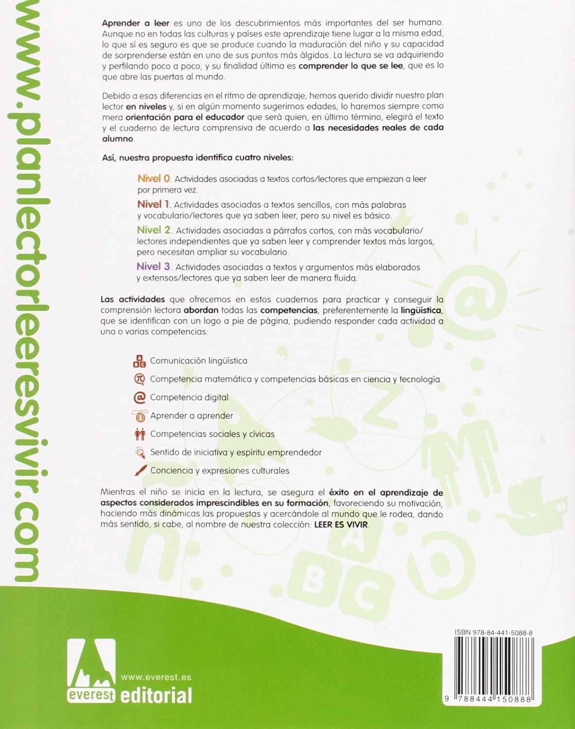 Recoge las actividades a realizar por los niños después de la lectura de determinados capítulos del libro, con planteamientos diversos, lúdicos y motivadores. Para facilitar el trabajo la estructura se organiza en bloques de lectura y las actividades están presentadas de forma clara, precisa y concreta. La tipología de actividades viene definida por las establecidas, en función de la edad, por las propuestas reflejadas en los informes PISA y PIRLS y la práctica habitual en las aulas para el desarrollo de la Competencia lectora: comprensión, velocidad y eficacia lectoras. Basa sus propuestas de actividades en los procesos de comprensión, los propósitos de la lectura y las conductas y actitudes ante la lectura en los distintos contextos del aprendizaje lector. Incluye solucionario de las actividades propuestas al final del cuaderno.