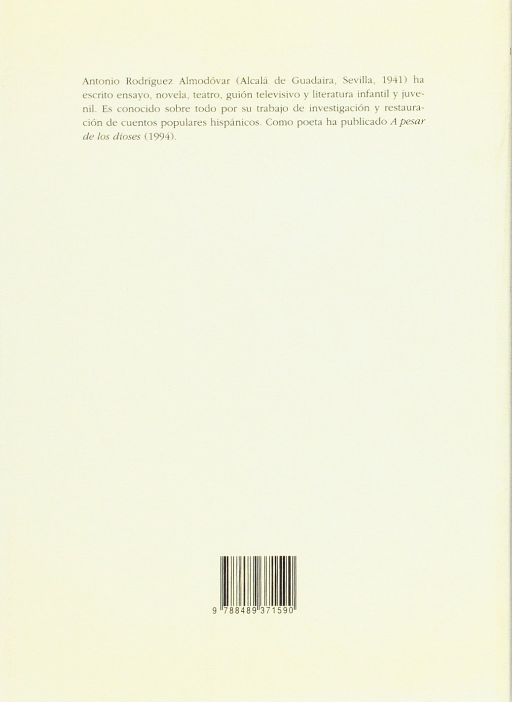Antonio Rodríguez Almodóvar (Alcalá de Guadaira, Sevilla, 1941) ha escrito ensayo, novela, teatro, guion televisivo y literatura infantil y juvenil. Es conocido sobre todo por su trabajo de investigación y restauración de cuentos populares hispánicos. Como poeta ha publicado, además de Poemas del viajero (1999), A pesar de los dioses (1994).