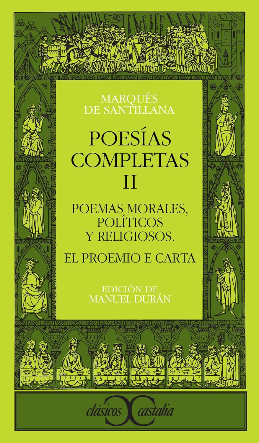 Introducción. Suplemento Bibliográfico. Poesías Completas, II. V. Poemas Morales. Políticos y Religiosos. Decir contra los aragoneses. Pregunta de nobles. Los Proverbios o Centiloquio .Coplas al muy excellente é muy virtuoso señor don Alfonso, Rey de Portugal. Bias contra Fortuna: Prohemio del Marqués al Conde de Alva. Comienza el diálogo de Bias contra Fortuna. Favor de Hércules contra Fortuna. Doctrinal de privados. Otras coplas del dicho señor Marqués sobre el mesmo casso. Croniçaçion de los Bienaventurados Sanctos. Maestre Viçente Ferrer. Predicador. é Maestre Pedro de Villacreçes. Frayre Menor. Los goços de Nuestra Señora. Coplas a Nuestra señora de Guadalupe. Oración.VI. Prosa. El proemio e carta. Variantes de los manuscritos, Y.A. y M-[referidas a los volúmenes I y II de Poesías Completas del Marqués de Santillana Clásicos Castalia núms. 64 y 94]. Glosario. Índice de Láminas.