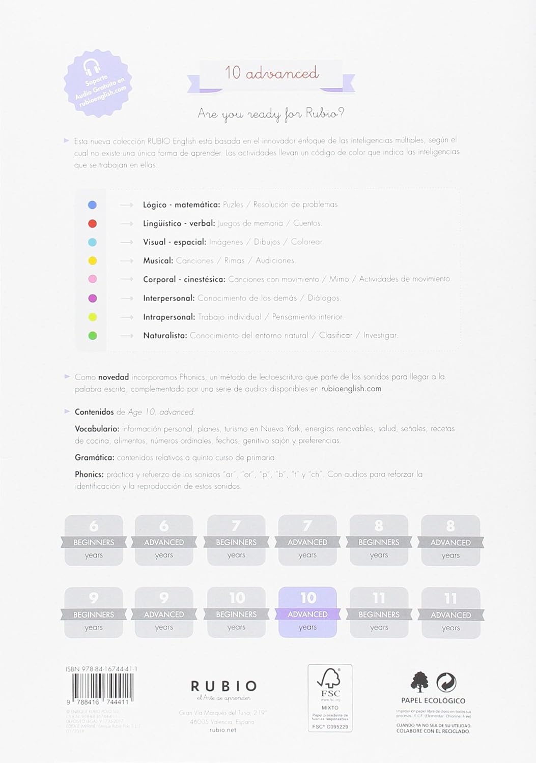 There you go! En el nivel advanced para 10 años subimos un poco el nivel. Creado con el innovador enfoque de las inteligencias múltiples, según el cual no existe una única forma de aprender, las actividades llevan un color code (código de color) que indica las inteligencias que se trabajan en ellas. VOCABULARIO En este cuaderno continuamos aprendiendo Inglés acompañados por David, Lucy y Henry el repasando el vocabulario de: – Información personal – Planes – Turismo en Nueva York – Energías renovables – Salud – Señales – Recetas de cocina – Alimentos – Números ordinales – Fechas – Genitivo sajón – Preferencias GRAMÁTICA Contenidos relativos a 5º de Primaria. PHONICS El cuaderno incorpora Phonics, un método de lectoescritura que parte de sonidos para llegar a la palabra escrita, completado por una serie de audios disponibles en rubioenglish.com. En estos audios trabajaremos la práctica y el refuerzo de los sonidos “ar”, “or”, “p”, “b”, “t” y “ch”. El cuaderno de 28 páginas y en formato A4.