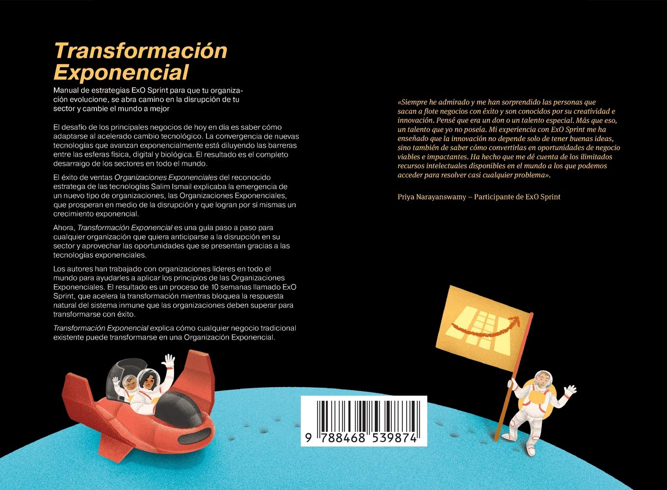 Manual de estrategias ExO Sprint para que tu organización evolucione, se abra camino en la disrupción sectorial y cambie el mundo a mejorEl desafío de los principales negocios de hoy en día es saber cómo adaptarse al acelerado cambio tecnológico. La convergencia de nuevas tecnologías que avanzan exponencialmente está diluyendo las barreras entre las esferas física, digital y biológica. El resultado es el completo desarraigo de los sectores en todo el mundo.El éxito de ventas Organizaciones Exponenciales del reconocido estratega de las tecnologías Salim Ismail explicaba la emergencia de un nuevo tipo de organizaciones, las Organizaciones Exponenciales, que prosperan en medio de la disrupción sectorial y que logran por sí mismas un crecimiento exponencial.Ahora, Transformación Exponencial es una guía paso a paso para cualquier organización que quiera anticiparse a la disrupción sectorial y aprovechar las oportunidades que se presentan gracias a las tecnologías exponenciales.Los autores han trabajado con organizaciones líderes en todo el mundo para ayudarles a aplicar los principios de las Organizaciones Exponenciales. El resultado es un proceso de 10 semanas llamado ExO Sprint, que acelera la transformación mientras bloquea la respuesta natural del sistema inmune que las organizaciones deben superar para transformarse con éxito.Transformación Exponencial explica cómo cualquier negocio tradicional existente puede transformarse en una Organización Exponencial.