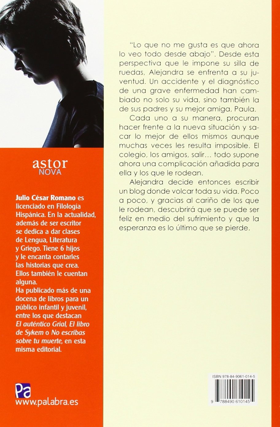 “Lo que no me gusta es que ahora lo veo todo desde abajo”. Desde esta perspectiva que le impone su silla de ruedas, Alejandra se enfrenta a su juventud. Un accidente y el diagnóstico de una grave enfermedad han cambiado no solo su vida, sino también la de sus padres y su mejor amiga, Paula.