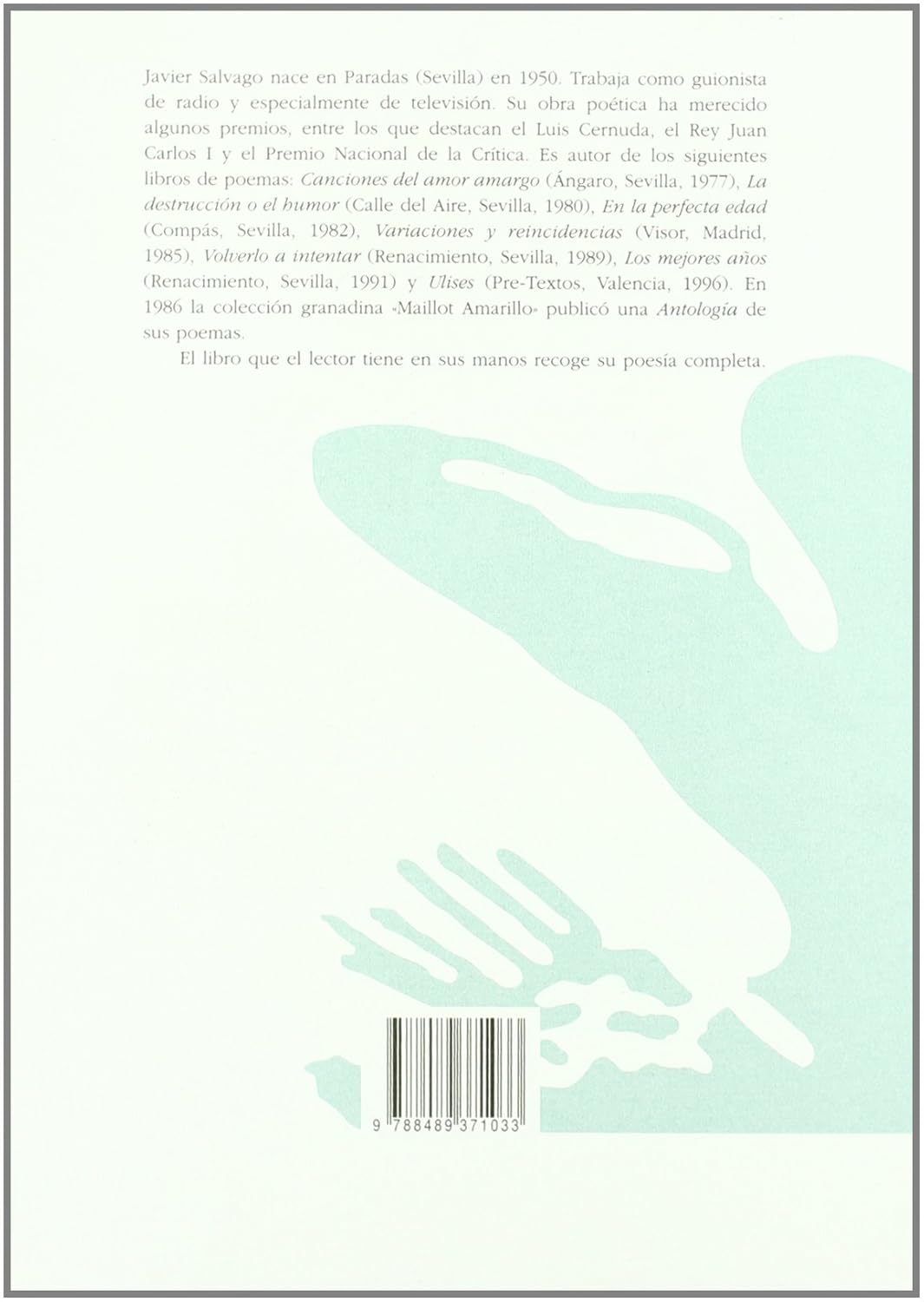 Javier Salvago nace en Paradas (Sevilla) en 1950. Trabaja como guionista de radio y especialmente de televisión. Su obra poética ha merecido algunos premios, entre los que destacan el Luis Cernuda, el Rey Juan Carlos I y el Premio Nacional de la Crítica. Es autor de los siguientes libros de poemas: Canciones del amor amargo (Ángaro, Sevilla, 1977), La destrucción o el humor (Calle del Aire, Sevilla, 1980), En la perfecta edad (Compás, Sevilla, 1982), Variaciones y reincidencias (Visor, Madrid, 1985), Volverlo a intentar (Renacimiento, Sevilla, 1989), Los mejores años (Renacimiento, Sevilla, 1991) y Ulises (Pre-Textos, Valencia, 1996). En 1986 la colección granadina «Maillot Amarillo» publicó una Antología de sus poemas. El libro que el lector tiene en sus manos recoge su poesía completa.
