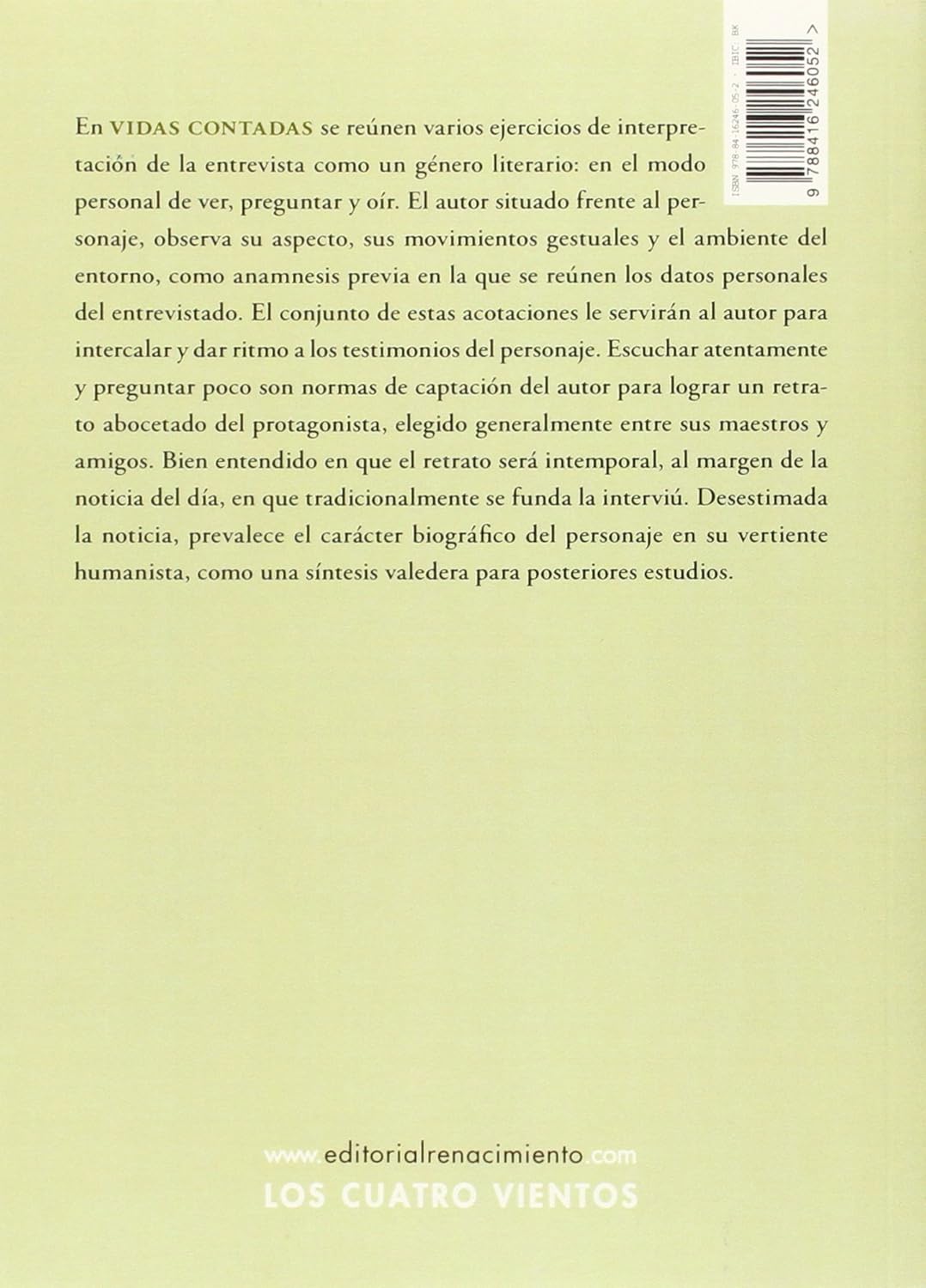 En Vidas Contadas se reúnen varios ejercicios de interpretación de la entrevista como un género literario: en el modo personal de ver, preguntar y oír. El autor situado frente al personaje, observa su aspecto, sus movimientos gestuales y el ambiente del entorno, como anamnesis previa en la que se reúnen los datos personales del entrevistado. El conjunto de estas acotaciones le servirán al autor para intercalar y dar ritmo a los testimonios del personaje. Escuchar atentamente y preguntar poco son normas de captación del autor para lograr un retrato abocetado del protagonista, elegido generalmente entre sus maestros y amigos. Bien entendido en que el retrato será intemporal, al margen de la noticia del día, en que tradicionalmente se funda la interviú. Desestimada la noticia, prevalece el carácter biográfico del personaje en su vertiente humanista, como una síntesis valedera para posteriores estudios. Marino Gómez-Santos ha cultivado la historia contemporánea a través del género biográfico. Además de Gregorio Marañón, es el primer biógrafo de Severo Ochoa, Francisco Grande Covián y la Reina Victoria Eugenia. Autor de más de un centenar de semblanzas científicas, entre sus libros más difundidos figuran Vida de Gregorio Marañón, Baroja y su máscara, El tiempo de Sebastián Miranda. Una España insólita, Mujeres solas, Diálogos españoles, Españoles sin fronteras, Mundo aparte, Tributo a Madrid, La Medicina en la pintura, Mi ruedo ibérico, Severo Ochoa. La emoción de descubrir o La memoria cruel, entre otros.